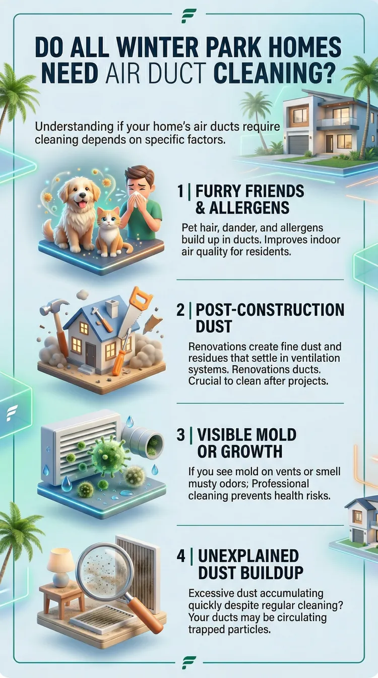 No. Air duct cleaning in Winter Park is necessary when a home shows documented conditions: visible debris or mold in the system, musty odors from supply vents, recent renovation work, occupants with allergy or respiratory sensitivities, or no recorded cleaning history. For homes without those factors, NADCA recommends inspection and cleaning every three to five years. Winter Park's sustained humidity and seasonal pollen load do increase contamination risk compared to drier climates, making periodic evaluation a sound practice for most homeowners here — but not a reason to schedule service every year.